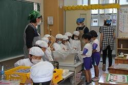 今日から1年生の給食当番となり、配膳を行いました。どのくらいの量を入れたらいいか手伝いに来た職員に聞きながらよそり、初挑戦を乗り切りました。