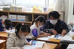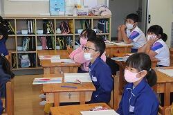 例年は社会科見学で、県の埋蔵文化センターなどを訪ね、勾玉作りなどを行います。今年は、新型コロナウイルス感染防止のため中止となったため、自然教育センターの職員を講師として招き、勾玉作りを行いました。古代人の首飾りを実際に作ってみると、手作業のたいへんさを実感できました。