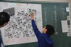 今日は「いじめ」について考えました。大勢の人が暮らすクラスの中では、それぞれの感じ方がちがいます。その中で、受け止めかたによっては不快を感じることもあります。今日は、例示された絵を観察し、どんな問題が潜んでいるかを考えていきました。そして、軽い気持ちで行った行動でも、いじめへと繋がっていく危険が潜んでいることを学習しました。
