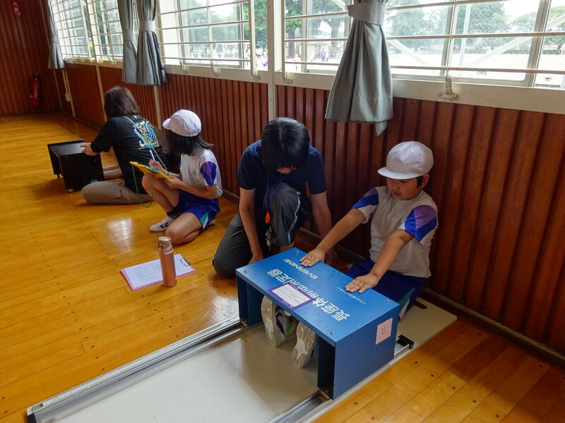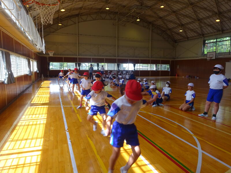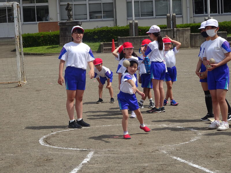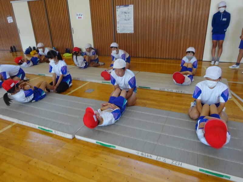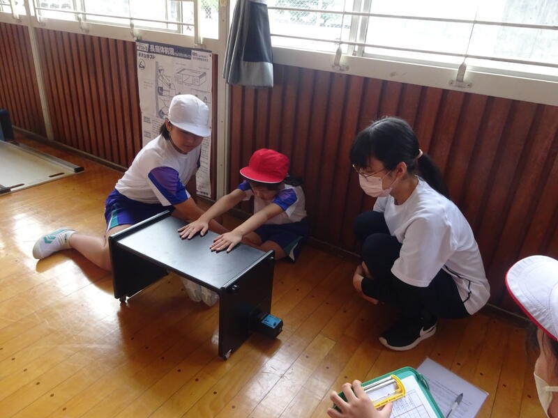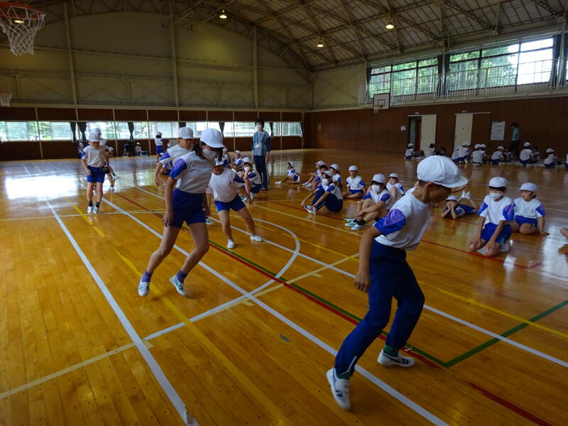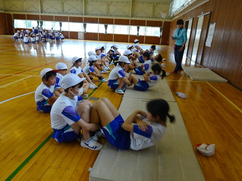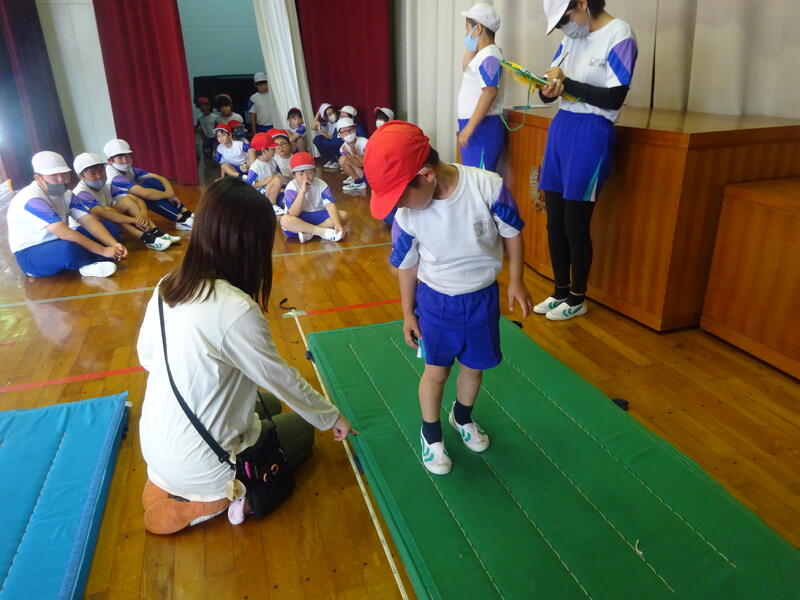 体力テストでは、6年生が1年生の面倒をみながら、各種目をまわりながら計測しました。体育館と校庭で行いました。一緒に取り組むことで1年生と6年生の関係がより深まりました。