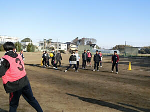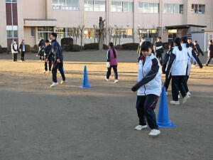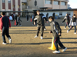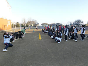 3回目の冬期体力づくりです。今回は、鬼ごっこ(バナナ鬼)をやりました。鬼に触られるとバナナになり、両手を上にあげて止まります。味方が助けに来ると、1回目のタッチで、片手を下げられ、2回目で元に戻ることができます。ビブスを付けた体力自慢の鬼たちに追われ、多くのバナナが誕生しました。しかし、仲間思いの友人が助け、バナナが増えたり減ったり、最後は鬼も体力的にきつくなったようでした。