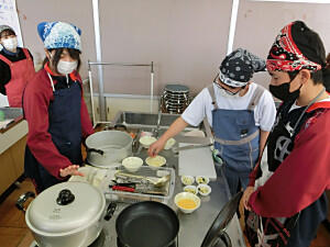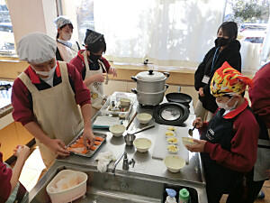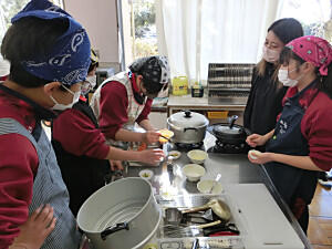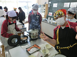 3,4校時に1年生の調理実習を行いました。今回も調理ボランティアの方にお手伝いいただきました。生徒の皆さんも、調理しながら片づけをしたり、次の準備をしたりと手際よく行っていました。おいしい肉じゃがとほうれん草の胡麻和えが完成しました。
