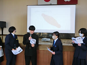 福祉委員会による朝会が行われました。今回は、福祉に関するクイズが行われました。生徒の皆さんは、正解が多く福祉に関心が高いことがわかりました。