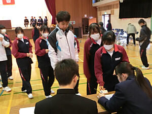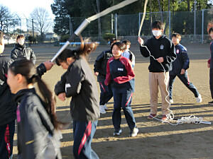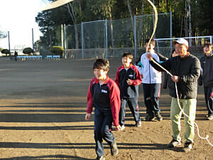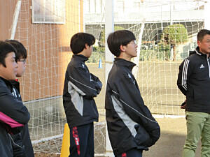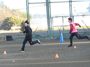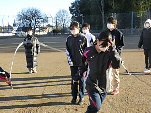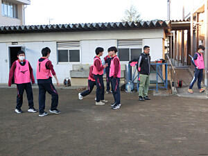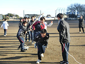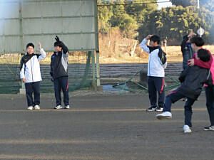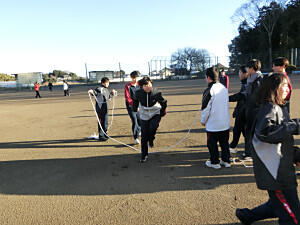 3回目の冬期体力づくりです。今回は、鬼ごっこ(バナナ鬼)をやりました。鬼に触られるとバナナになり、両手を上にあげて止まります。味方が助けに来ると、1回目のタッチで、片手を下げられ、2回目で元に戻ることができます。ビブスを付けた体力自慢の鬼たちに追われ、多くのバナナが誕生しました。しかし、仲間思いの友人が助け、バナナが増えたり減ったり、最後は鬼も体力的にきつくなったようでした。