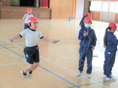 1年生は体育館で短なわ跳び、2年生は生活のアルバム作り、5年生は外国語でアルファベットを書く練習をしていました。