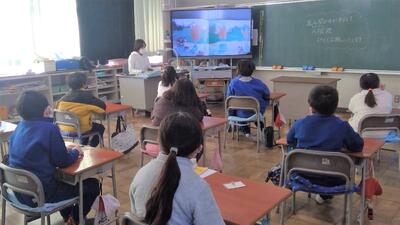 1時間目に始業式を行いました。感染症対策で、各教室と校長室をリモートでつないで式を行いました。話をよく聞くことの大切さや、目標に数字を入れると効果があるという話を聞きました。子供たちは自分の新年の目標に具体的な数字を入れることで、さらに意欲をもって新学期をスタートしました。