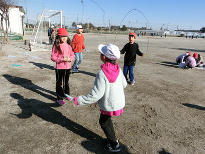 準備運動をして、5分間校庭を周回しました。低学年は、トラックに沿って、高学年の児童は、トラックの外側を走ります。各自のペースで走りました。