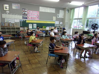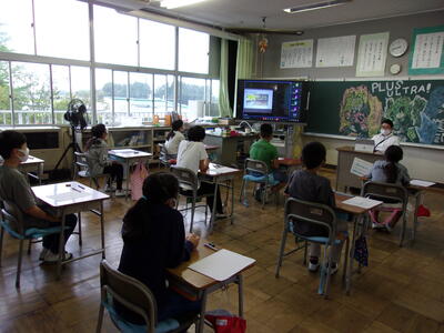 児童が集まることを避け、各教室でオンラインでの始業式を行いました。校長から、新型コロナウイルスに感染しないよう今まで以上に気を付けて生活をすること、我慢することも増えるので優しい気持ちで友達に接すること、実りの秋となるようこれまでのことを振り返りながら工夫して勉強や運動に取り組むことについて「気づき 考え 実行する」の態度目標と関係付けて話ました。