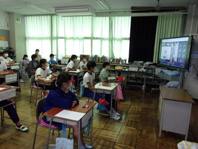 全体研修でやり方を確認した後、教師が各教室に行き、ホストの教師とやりとりしながら練習してみました。