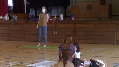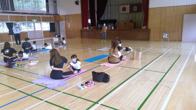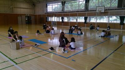 開講式終了後、1年生児童とともに体育館に集まり、親子でヨガを楽しみました。講師に遠藤楓先生をお迎えし、呼吸方法やヨガを通しての体の状態の変化について体験を通しながら学びました。