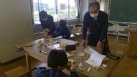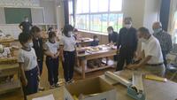 「ギコギコクリエーター」は、木材をのこぎりで切って部品をつくり、釘やボンドで組み合わせて作品を作る学習です。学習ボランティアの櫻井慎也様、青山誠様、大島基圓様、中里勝美様、ボランティアコーディネーターの中里絹代様、大島利子様に御指導いただきながら学習を行いました。初めてのこぎりを手にする児童はほとんどで、のこぎりの使い方をボランティアの方から教えていただきました。小さな部品を切るときなど、ボランティアの方にたくさんサポートしていただきました。