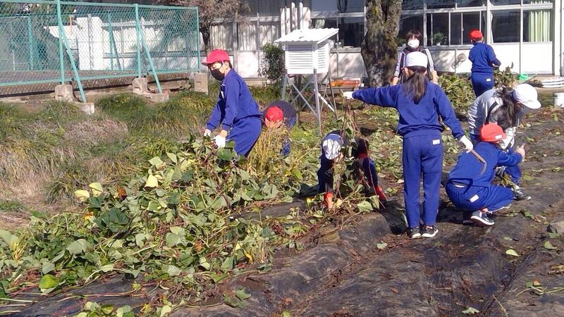 さつまいも畑のつる刈りを6年生が行いました。つるが絡まり合いながら畑一面を覆っているので、少しずつ切りながらつるの処理をしました。思ったよりも重労働でした。