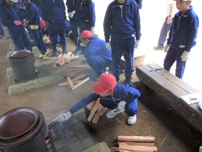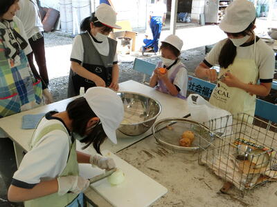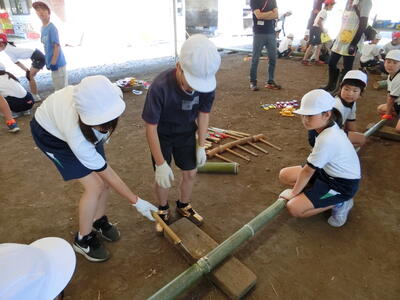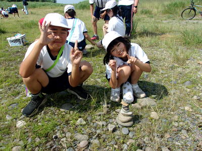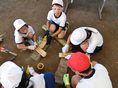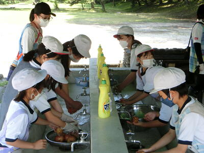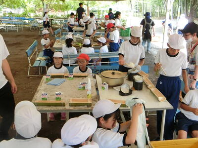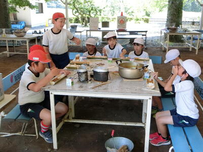 今日の野外炊さんでは、昨日児童が作成した竹の食器を使ってカレーライスの調理をしました。縦割り班で役割を分担し、協力しておいしいカレーを食べることができました。午後は、火起こしや河原遊びをして、夕食後はお楽しみ会をしました。