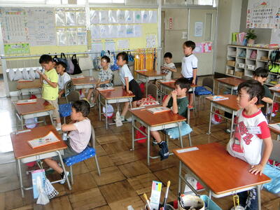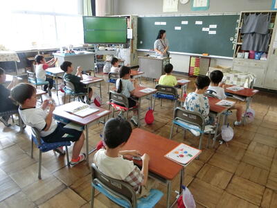 1年生の算数「いくつといくつ」の足し算では、数字カードで繰り返し練習し、指名されると覚えた数を発表しています。