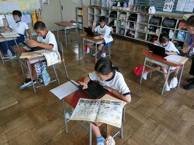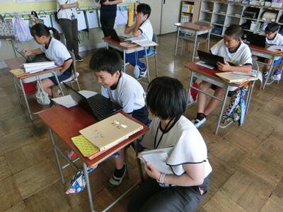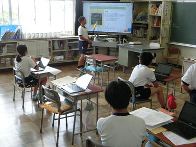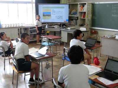4年生の社会「ごみのしょりと利用」では、エコステーションの仕組みや学んだ内容をタブレットでまとめ、電子黒板を使って発表しています。