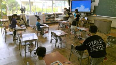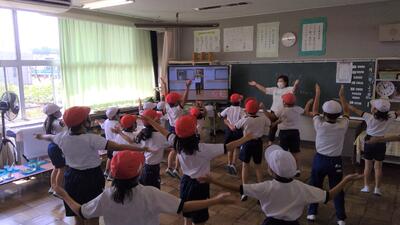 1・2年生合同で、運動会で披露するダンスの練習をしました。モニターに映された映像を見ながら音楽に合わせて練習をしました。