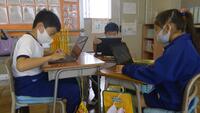 2時間目に、ICT機器を活用した理科の授業を行いました。「ヒトのたん生」について各自調べたことを持ち寄り、グループごとに1枚のシートにまとめました。「共同編集」という機能を使い、グループごとに端末をつなぎ、各自の端末から1枚のシートに直接情報を入力し、協力して調べたことをまとめていました。