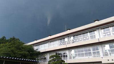 昨日は、雷の発生によるお迎え等の急な対応に御協力いただきありがとうございました。突風と大雨で被害が出たところもあったようです。雨が降り出す直前、空に漏斗雲と呼ばれる雲が発生しました。これは、竜巻が起こるときの前兆となる雲です。雨が降り始めてこの雲は消えましたが、風がが強まったときは、児童と迎えに来ていただいた方に、一時シェルターへの避難をしていただきました。