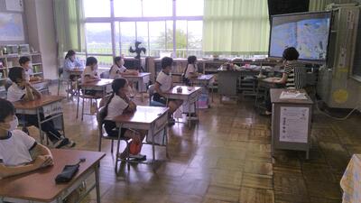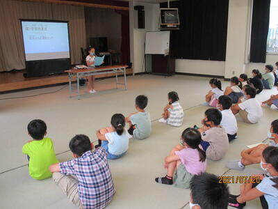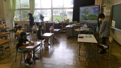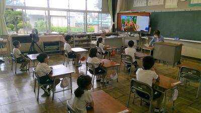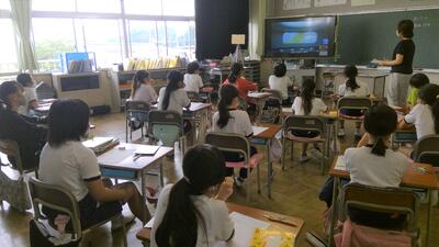 朝の読み聞かせは、今日が1学期最後です。児童は、いつもこの時間をとても楽しみにしています。食い入るように絵本が映し出された画面を見て、お話を聞いていました。
