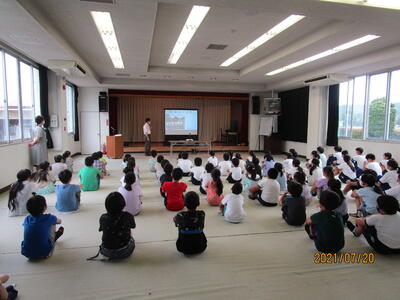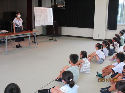 いよいよ長い夏休みが始まります。児童指導主任から夏休みの過ごし方について話がありました。