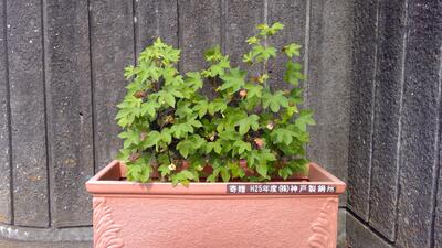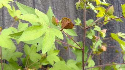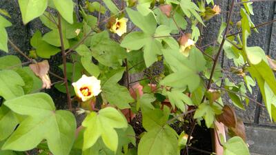 校門の両側の大きなプランターに、綿が植えられています。背丈が70~80㎝に伸び、花を咲かせていました。