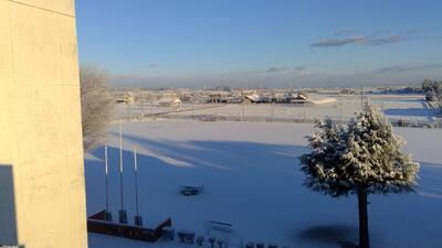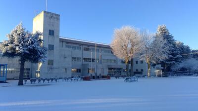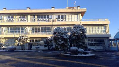 7日朝の西田井小学校の様子です。校舎の北側では3㎝程度の雪が積もっていました。