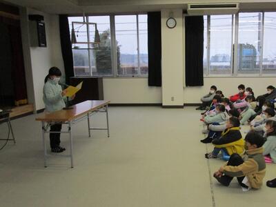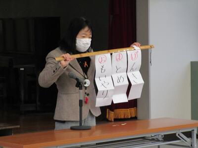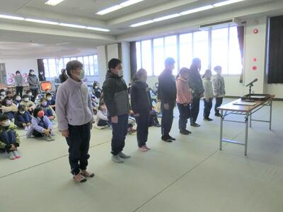 最後に、児童指導主任から「おまけ」を頭文字に、3学期の生活について話がありました。友達に対しておもいやりをもって生活をする、1年間のまとめをする、げ(け)んきに生活するの3つを意識して生活してほしいと思います。