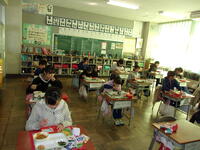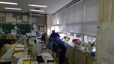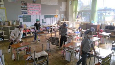 感染防止対策の一つとして、今日から、縦割り班の清掃を一時停止し、学年ごとに教室や階段特別教室の清掃を割り振り、他学年との接触が少なくなるようにしました。また、感染が心配されるトイレ、流し、保健室は教師が手分けして清掃するようにしています。低学年児童も、話をせずに真剣に清掃を行っていました。