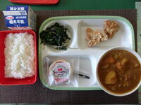 今日の給食は、西田井小の児童が希望した献立です。とりのから揚げ、磯辺あえ、カレー、いちごタルト、ごはん、牛乳が献立です。