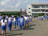 震度6強の地震が発生した設定で校庭に避難した後、帰宅する準備をし、保護者の迎えを待ちました。