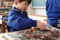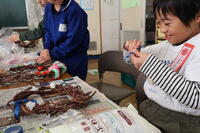根本山自然観察センターでは、秋の色づいた葉や木の実を採り、おもちゃを作りました。ドングリに穴をあけることが難しかったようですが、やじろべえやこまを上手に作っていました。