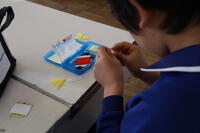 アートクラブでは、プラバンに絵を描いたり、アイロンビーズで好きなキャラクターを作ったり、小物入れに飾りを縫い付けたりして、仲間たちと楽しく活動していました。