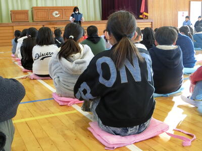 今日からいよいよ3学期です。元気な児童たちの笑顔が戻ってきて、学校が活気にあふれているのを感じました。職員も、自然と笑顔になりました。1時間目の始業式の様子です。