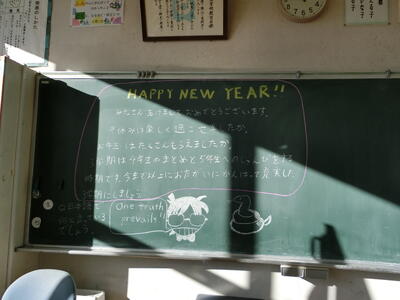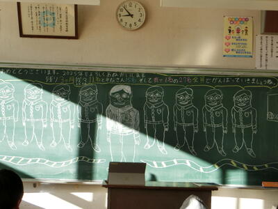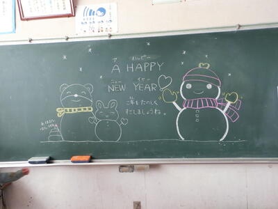 3学期開始にあたり、各担任の先生たちが黒板に絵を描いて、児童たちを迎えました。