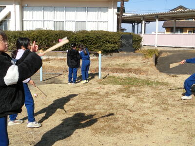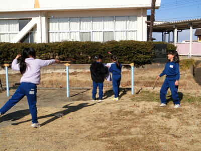 4時間目、2年生たちは校庭で元気に羽根つきをしていました。