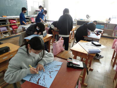 6年生は、「班で広がるわたしの思い」という題で、版画制作をしています。