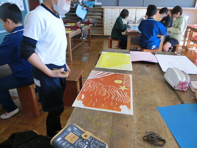 5年生は、「ほり進めて刷り重ねて」という題で、多色刷りに取り組んでいました。