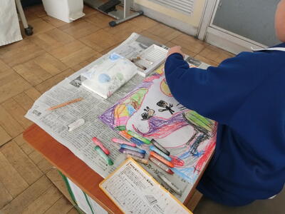 1年生は、「せんのぼうけん」という題で、絵を描きました。描き続けていくうちに発想が広がり、のびのびと自分が好きな世界を描いていました。