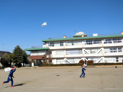 今日、1年生は生活科で凧あげをしました。白いビニールに自分の好きな絵を描いて凧にしました。あまり風がない日だったので、子どもたちは自分が力いっぱい走ることで風を作っていました。冬の寒さを忘れるくらい、一生懸命走っていました。上がった凧を見て、1年生たちは笑顔いっぱいでした。「今度は風がある日に上げたいね。」と、まだまだやる気満々でした。