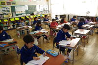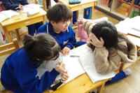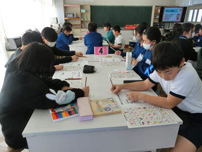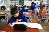 本校では火、木曜日の朝、進徳タイムという時間を設けて1時間目が始まる前に学習に励んでいます。どの学年も熱心にプリントに取り組み、時に教え合いをしていました。