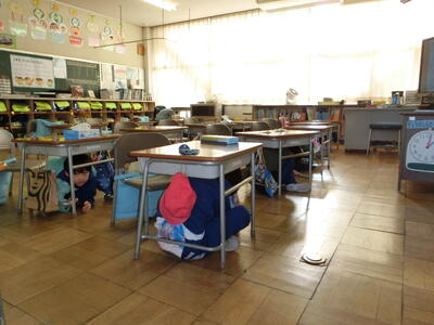 昼休みなので校庭で遊んでいた児童、教室にいた児童と様々でしたが、校庭にいた場合は校庭の中央に集まったり、教室にいた場合は机の下に入って身を守ったりと、児童たちは素早く自分の命を守る行動することができていました。