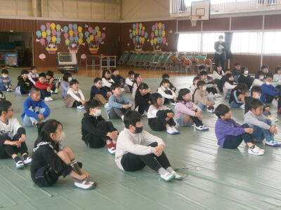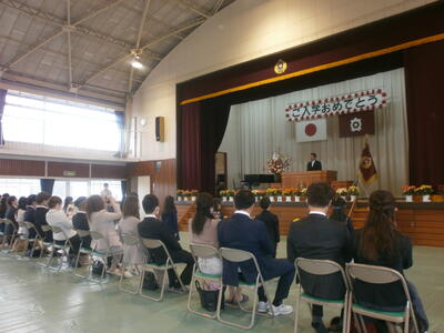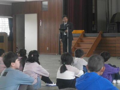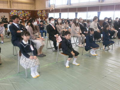 「春の優しい雨が満開の桜や木々を潤し、全ての生き物が躍動を始める中、ご来賓様、御臨席を賜り、そして、新入生の保護者の皆様のご列席のもと、令和六年度大内東小学校入学式を挙行できますことを心よりお礼申し上げます。さて、新入生の皆さん、ご入学おめでとうございます。今日から、皆さんはこの東小学校の一年生です。担任の先生から一人ひとり名前を呼ばれ、しっかりと返事ができました。校長先生の話を聞いている皆さんの姿勢は、背中が伸び、目も輝いています。とてもすばらしいです。皆さんがこの東小学校に入学してきてくれて上級生のお兄さん、お姉さんや、先生方も、とてもうれしく、そして、とても楽しみにしていました。小学校では教室で国語や算数を勉強したり、広い校庭や体育館で運動をしたりします。歌を歌ったり、絵をかいたりもします。英語の勉強もします。楽しい遠足や、運動会もあります。おいしい給食もあります。もしも、何か心配なことや困ったことが起きたら、先生にお話ししてください。ここで、みなさんに立派な一年生になってもらうために、校長先生から頑張ってほしいことを三つお話します。一つ目は東小の「ひ」、「ひとりでできる みんなでできる」です。朝は一人で起きられるようになってください。一人で着替えができるようになってください。通学班で登校できるようになってください。一年生になったので、いろいろなことができるようになりましょう。そして、学校には、たくさんのお友達、上級生のお兄さん、お姉さんがいます。協力し合って、たくさんのことをできるようになってください。二つ目は、東小の「が」、「頑張り抜く」です。これからたくさん勉強をします。運動もします。すぐにはできないものもあるかもしれません。でも、心配しないでください。必ずできるようになります。先生方が丁寧に、一生懸命に教えてくれます。あきらめずに最後まで頑張り抜いてください。三つ目は東小の「し」、「親切にできる」です。学校にいるたくさんのお友達に親切にできる人になってください。そして、お友達と楽しく、仲よく過ごしてください。それでは一年生のみなさん、三つのことを頑張り、立派な一年生になってください。」