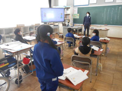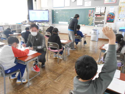 2年生は、音楽の時間で、歌の発表をしていました。「ゆうやけ こやけ」を音程に気を付けて、少人数でもしっかりと歌っていました。4年生は、国語の授業で、「言葉の意味と使い方」の学習でした。複数の意味をもつ言葉でクイズをつくっていました。