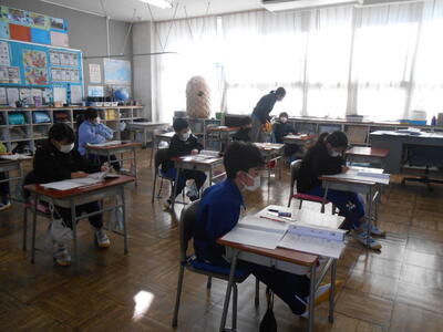 今日は学力調査の実施日です。国語はCDの聞き取りから始まりました。言葉の使い方や文章の読み取り、自分の考えなどを書く課題なども出題され、これまでの定着度が調査されます。振り返りや復習などを取り入れ今後に生かせるようにしていきたいと思います。
