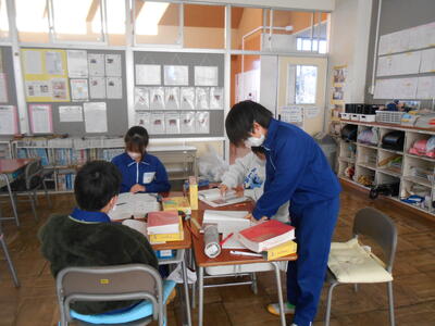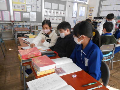 1年生は、音楽集会にむけて曲名などの進行の言葉を分担し、練習をしていました。2年生は、国語の復習プリントにチャレンジしていました。