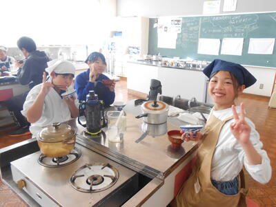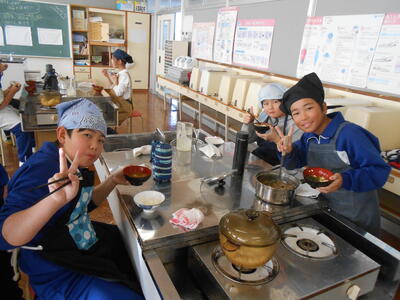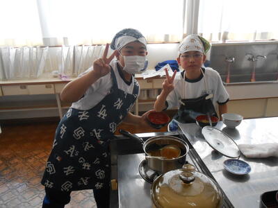 5年生は、家庭科のごはんとみそ汁の調理実習でした。ごはんを透明の鍋で焚き、みそ汁の出汁も煮干しや鰹節でとっていました。グループで協力して行っていました。