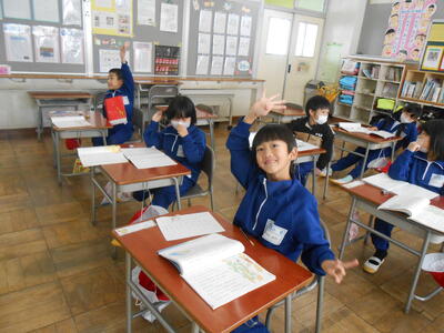 1年生は、交通安全レターをおうちの人に書いていました。久々の登校でしたが、いつもよりちょっとおとなしく感じました。2年生は、国語の授業で、話すこと・聞くことの学習でした。町探検に行った場所で質問した内容や心に残ったことを一人一人発表していました。