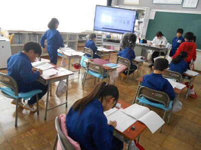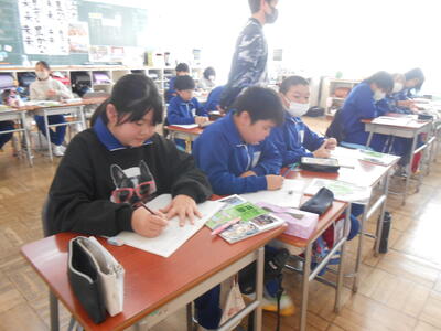 5年生は、図工の授業でした。「笑顔がうまれるしかけ」という題材で、自分のアイデアを生かし、みんなが笑顔になれるような工夫をした作品づくりに取り組んでいました。6年生は、国語の物語「海のいのち」のまとめで、印象に残った場面をカードに書く活動でした。