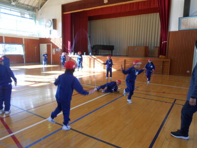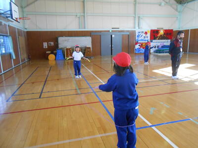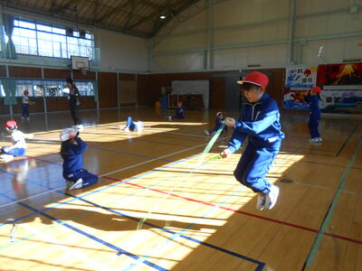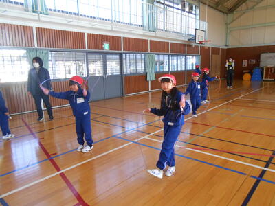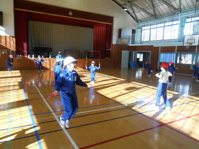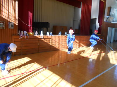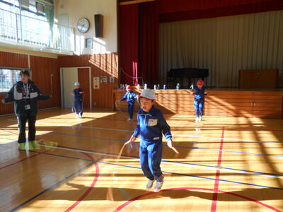 1.2年生は、合同で体育を行っていました。縄跳びの練習で、1年生は前跳びやあや跳びを中心に、2年生は交差跳びや二重跳びまで挑戦していました。冬の縄跳びは体力つくりには絶好です。冬休みなどもチャレンジできるといいですね。