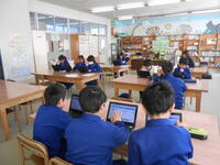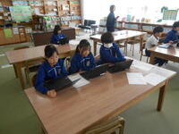 3年生は、社会科の授業でした。工場のしごとについて調べたことを、グループごとにまとめ、発表する準備をしていました。4年生は、図工で学校のいろいろな場所で、タブレットで写真を撮って作品づくりをしていました。絨毯を接近して撮影し砂漠の風景に見立てたり、楽器を工場の建物に見立てたり、子供ならではの発想で取り組んでいました。